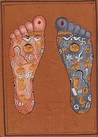 The Vishnu Pada Footprints are significant objects connected with episodes in his mythology, so that his feet symbolize the unity of the entire universe. Similarly, the feet of Buddha are transformed into an intricate map of his teachings, which are set symbolically in a many-layered universe. They often bear distinguishing marks, such as a Dharma chakra at the centre of the sole. Both of these are congruent with the belief in reflexology that the feet represent the larger whole.